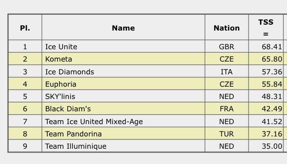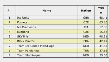 Ottima prestazione del team chiavennasco, classificatosi al terzo posto della classifica con un punteggio totale di 57.36, record stagionale della squadra, dietro solo alle inglesi Ice Unite e alle ceche Kometa.
