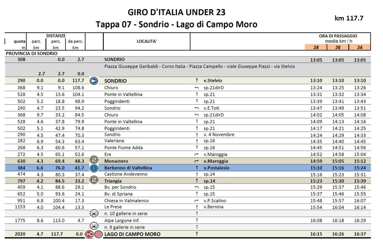 Manca pochissimo all'attesa tappa tutta valtellinese del Giro D'Italia Giovani Under 23. Sondrio e il suo comprensorio si apprestano a vivere una grande giornata di sport con la carovana rosa assoluta protagonista. In Piazza Garibaldi è ormai tutto pronto e cresce l'attesa per la partenza della 7^ tappa che porterà i corridori, dopo aver superato oltre 3100 metri di dislivello, all'arrivo al Lago di Campo Moro. Una tappa di 119,4 km che toccherà i comuni di Sondrio, Chiuro, Ponte in Valtellina, Poggiridenti, Berbenno, Castione Andevenno, Spriana, Chiesa in Valmalenco, Lanzada. La partenza è prevista alle 13,05 in Piazza Garibaldi a Sondrio, da li i corridori affronteranno un circuito da ripetere due volte che li porterà verso Chiuro e Ponte e successivamente dopo il secondo passaggio nel capoluogo la discesa verso Berbenno dove affronteranno il primo dei tre GPM della giornata, l'ascesa verso Monastero. Poi, passando da Castione, la seconda salita odierrna verso il GPM di Triangia e quindi la discesa verso Mossini per poi affrontare i 29 km verso l'arrivo di Campo Moro. Una salita finale caratterizzata dalla presenza di 18 gallerie, di queste 5 in pavè e una in sterrato misto pavè. Da Sondrio partirà indossando la maglia rosa lo spagnolo Ayuso, dominatore finora della corsa dopo l'impresa compiuta nella tappa di Sestola. Non è prevista la diretta televisiva della tappa, ma la differita che dovrebbe iniziare alle 17,05 su RaiSport canale 58 del digitale terrestre. L'organizzazione della corsa ha richiesto modifiche alla circolazione nel comune di Sondrio. Questo quanto previsto: divieto di sosta con rimozione forzata in via Colonnello Alessi, Largo Folla, via Lungo Mallero Cadorna, via Caimi, nel tratto da via Trento a piazza Garibaldi, via Ragazzi del '99 e su tutti gli stalli di piazzale Valgoi. Divieto di circolazione in via Colonnello Alessi, Largo Folla, via Lungo Mallero Cadorna, via Caimi, nel tratto da via Trento a piazza Garibaldi, e in via Ragazzi del '99. Infine, è istituito divieto di sosta con rimozione forzata in via Piazzi già dalle 8 e la stessa disposizione sarà valida a partire dalle 10,30 anche in via IV Novembre, via Fiume, via Toti, via Tonale, negli stalli posizionati a lato strada. Domani il Giro vedrà ancora protagonista la nostra provincia, ma solo come sede di partenza con l'Aprica per una tappa che dopo aver scalato il Passo del Tonale porterà i corridori all'arrivo di Andalo (Trento).