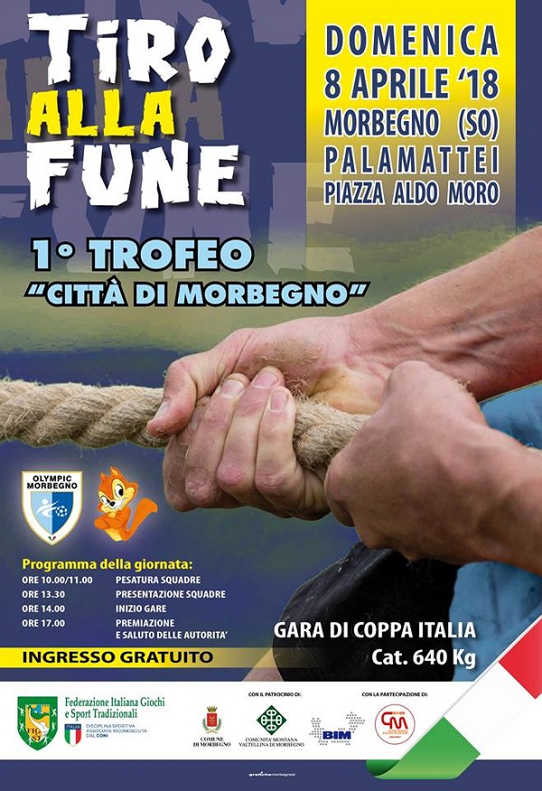 Un pubblico numeroso ha fatto da cornice domenica al primo Trofeo "Città di Morbegno" di tiro alla fune. Nella città del Bitto è approdata una tappa del circuito di Coppa Italia, categoria 640 kg, e la squadra di casa dell'Olympic Morbegno si è fatta onore chiudendo al quarto posto. Soddisfatto il direttore tecnico Matteo Speziale: <<Abbiamo centrato l'obbiettivo prefissato, andare in semifinale, ma quello che ci lascia soddisfatti è il fatto di riuscire a competere con le migliori tre squadre italiane. Merito dei ragazzi che ci hanno sempre creduto in questi mesi di duro allenamento>>. Il successo è andato al team favorito della vigilia, quello dei toscani del Cobra. In seconda e terza posizione hanno chiuso rispettivamente Bellatorres e Black Bull.