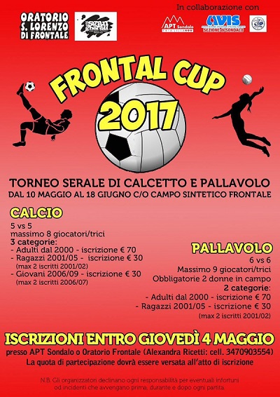 Torna in alta valle "Frontal Cup", competizione serale di calcio a 5 e pallavolo organizzata dall'Associazione Giovani Frontale in collaborazione con Apt e Avis Sondalo. Le iscrizioni si chiuderanno giovedì prossimo e dal 10 maggio al 18 giugno sul campo in sintetico di Frontale si disputeranno tutte le partite. Per entrambe le discipline le squadre possono essere miste con un massimo di 8 iscritti per il calcio e 9 per la pallavolo. Nel 2016 parteciparono 28 formazioni al torneo e ad imporsi nel calcio, categoria adulti, fu la squadra del "Wild and Wine" con Matteo Guerreschi premiato come miglior giocatore. In basso la locandina con tutte le informazioni relative alle iscrizioni e al regolamento.