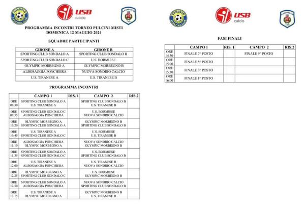 Dieci squadre in rappresentanza di 6 società valtellinesi daranno vita oggi a Sondalo alla prima edizione del Torneo Sportsondrio riservato alla categoria Pulcini misti. La manifestazione organizzata da US Bormiese, Sporting Club Sondalo, AS Grosotto prenderà il via alle 9,30 con le prime due gare dei gironi di qualificazione per concludersi alle 16 con la finale per il primo posto e le premiazioni. Le 10 formazioni, 3 dello Sporting Club Sondalo, 2 di Oympic Morbegno e Tiranese, poi Us Bormiese, Nuova Sondrio, Albosaggia Ponchiera sono state divise in due gironi. Per tutta la giornata sarà attivo il servizio bar e cucina presso la vicina tensostruttura.