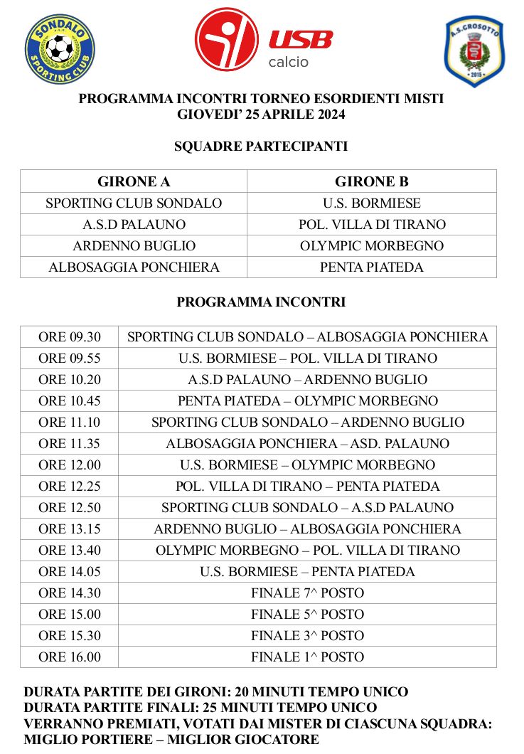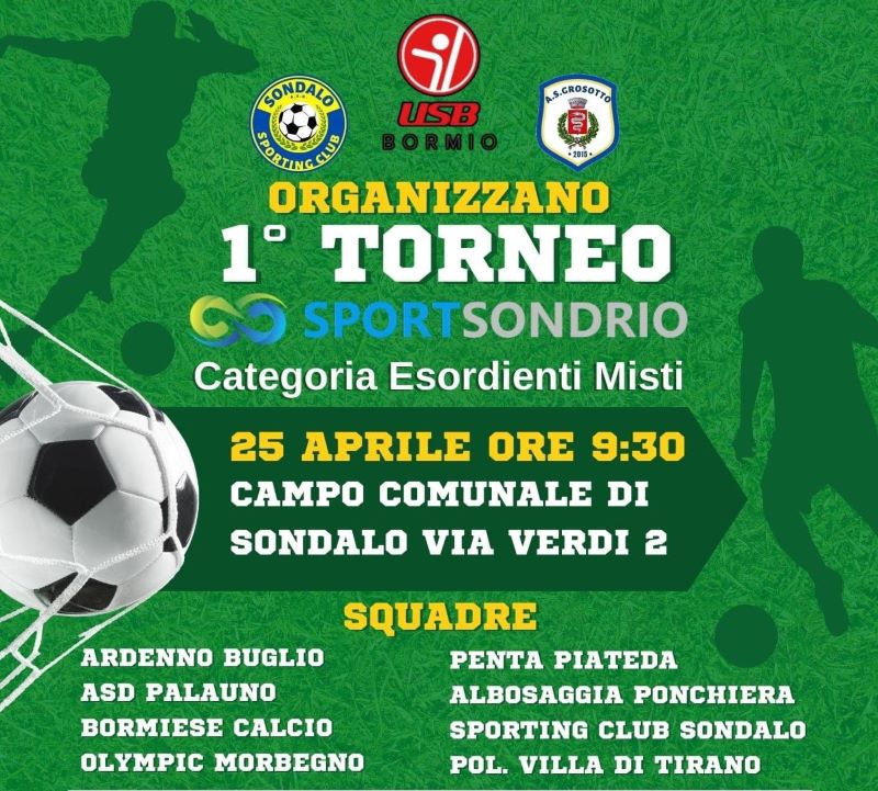 Con l'organizzazione di US Bormiese, Sporting Club Sondalo e AS Grosotto andrà in scena domani 25 aprile a Sondalo la prima edizione di un torneo giovanile riservato alla categoria Esordienti Misti. Saranno 8 le formazioni, in rappresentanza di altrettantte società, a scendere in campo a partire dalle 9,30. L'onore di aprire la competizione denominata "1° Torneo sportsondrio" spetterà ai ragazzi di casa dello Sporting Club Sondalo e all'Albosaggia Ponchiera. Le partite proseguiranno senza sosta fino alle 16 quando si giocherà la finale che assegnerà il primo posto. Alla fine, gli allenatori di ciascuna squadra saranno chiamati a dare la loro preferenza per eleggere miglior portiere e miglior giocatore. Per tutta la giornata presso la vicina tensostruttura saranno attivi bar e servizio cucina. E il 12 maggio si replica con un appuntamento dedicato ai Pulcini.