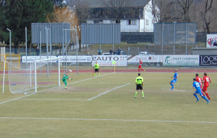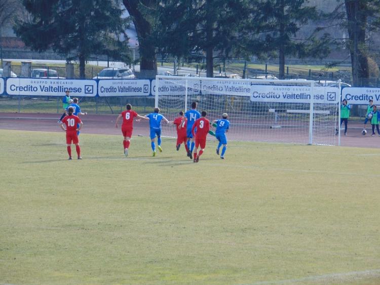 Una doppietta di De Respinis, per distacco il migliore in campo, decide la sfida con il Ciserano e avvicina il Sondrio alla permanenza in serie D. L'attaccante è stato il protagonista principale di una partita in pieno controllo da parte del Sondrio. Inoperoso o quasi Guerci. Subito pericolosa la squadra di casa al 3°: respinta su Beltrame, riprende D'Amuri che dal vertice dell'area piccola calcio con palla alta sopra la traversa dopo una deviazione. Dal corner non scaturisce nulla di pericoloso. Il vantaggio arriva allo scoccare dell'11° minuto, cross da destra e anticipo sul primo palo di De Respinis che in acrobazia supera Lancini. Al 33° proteste Sondrio per un contatto in area, sulla ripartenza ospiti pericolosi con Bertazzoli che da posizione defilata all'interno dei 16 metri non inquadra la porta con un rasoterra sul primo palo. Al 37° Ghisalberti si libera di forza dalla marcatura di Ambrosini e appena dento l'area calcia alto. Al 46° punizione laterale di Beltrame battuta sul secondo palo per Mara che viene anticipato con un vistoso tocco di mano, rigore limpido: sul dischetto si presenta Beltrame che calcia rasoterra alla destra di Lancini che intuisce e respinge. Le squadre vanno al riposo con il Sondrio avanti di un gol. Inizio ripresa segnato da un paio di incursioni di Beltrane cge salta facilmente l'uomo, ma non è preciso nella rifinitura. Al 16° rovesciata centrale di Bertazzoli, blocca in controtempo Guerci. Al 23° contropiede da manuale di De Respinis, assist al bacio per Beltrame che arriva a rimorchio, palla alta sopra la traversa dall'altezza del dischetto. Alla mezz'ora ancora immarcabile De Respinis, il numero 9 parte da metà campo supera gli avversari e a ridosso dell'area appoggia a D'Amuri, conclusione fuori misura. Altra occasione sprecata. Al 35° secondo rigore per il Sondrio, fallo ai danni di D'Amuri, dal dischetto De Respinis è implacabile. Ancora Sondrio al 42°. azione manovrata in area conclusa con un tiro di D'Amuri che colpisce la traversa e poi rimbalza sulla linea di porta. Al 46° il Sondrio cala il tris, ancora in contropiede, serie di tocchi ravvicinati a centrocampo per liberare Ronzoni sulla linea del fuorigioco, il capitano scambia con Valtulina e firma il gol più facile tutto solo davanti a Lancini.