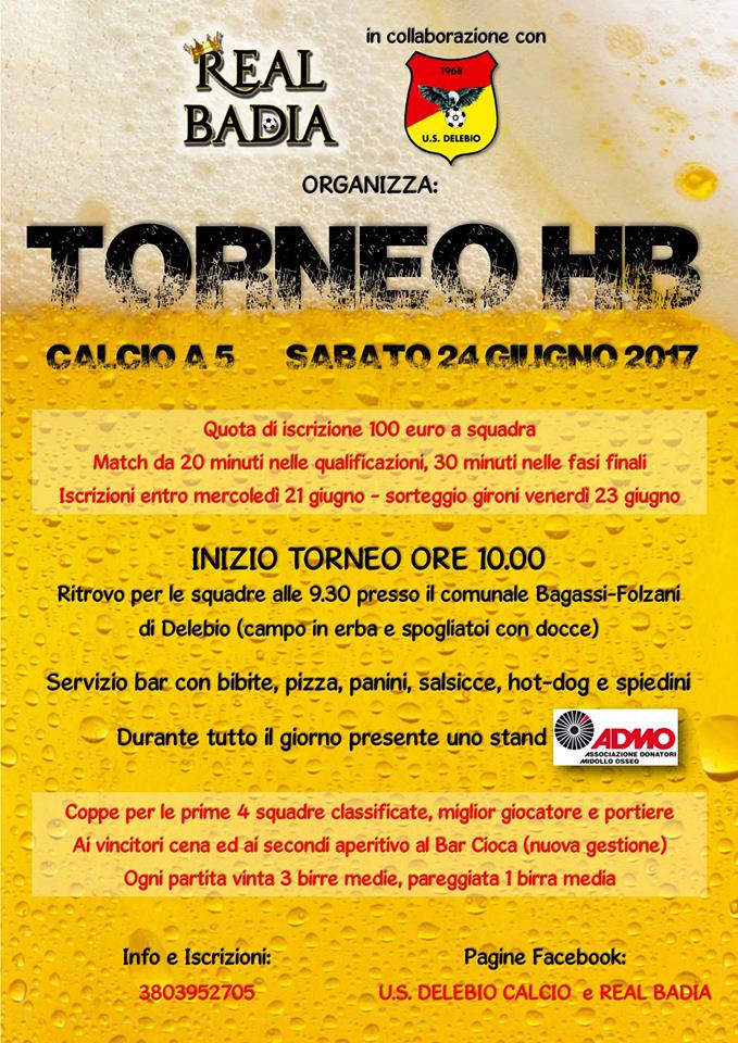 Un torneo di calcio a 5 che prevede premi particolari per le squadre capaci di vincere più incontri è quello che andrà in scena domani a Delebio. Organizzato dalla Real Badia con la collaborazione dell'Us Delebio il "Torneo HB" prevede, oltre ai vari premi finali, per ogni partita vinta tre birre medie e una per ogni pareggiata. Sarà una maratona calcistica che richiederà anche doti di resistenza particolari per le squadre più forti. Il "Bagassi- Folzani" verrà suddiviso in tre campi per permettere lo svolgimento in contemporanea di più partite. La giornata si aprirà alle 10 con Allievi 1-Bad Ragaz sul campo 1, Hertha T.D.-Matok sul 2 e ADMO Team-Animals sul 3. Per tutta la giornata sarà attivo il servizio bar-ristoro e sarà presente uno stand ADMO (Associazione Donatori Midollo Osseo).