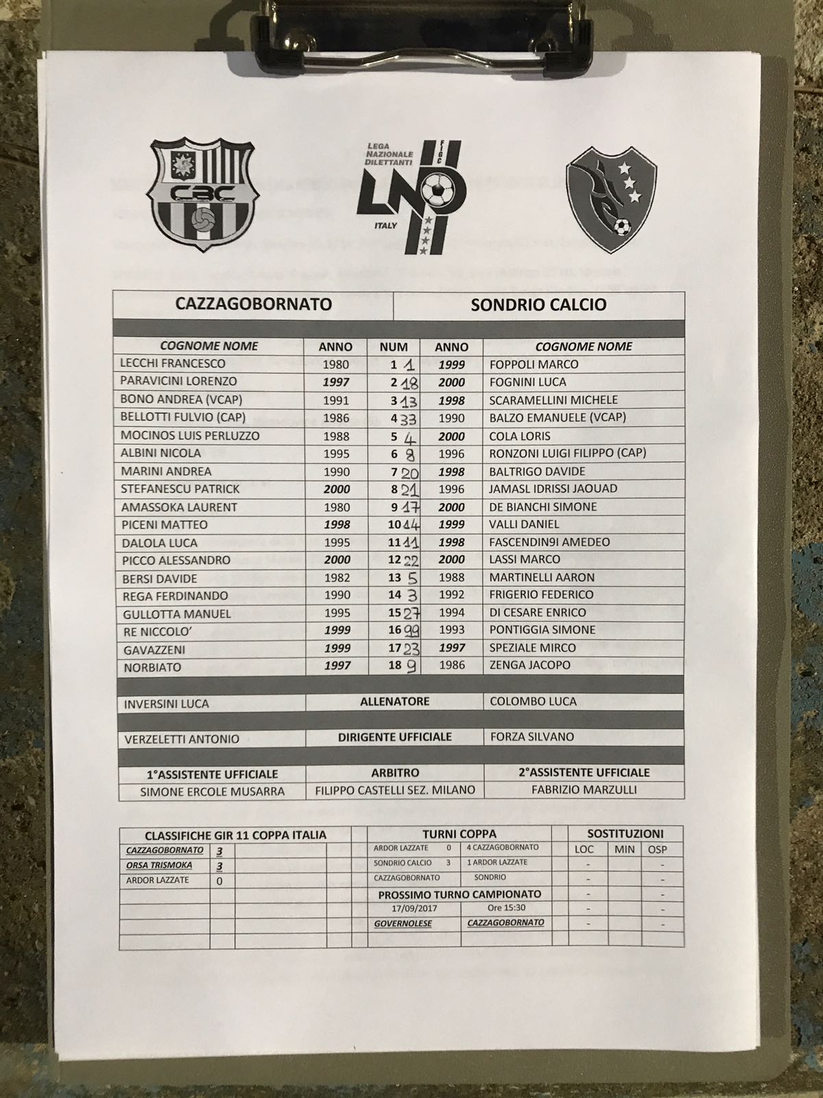 Nulla da fare per il Sondrio, fermato sul pareggio dal Cazzagobornato ed eliminato per la peggiore differenza reti rispetto ai rivali. La terza giornata della prima fase di Coppa Italia Eccellenza si chiude con un pari che lascia l'amaro in bocca ai ragazzi di Luca Colombo. Basta un minuto per trovare il gol del vantaggio grazie a Jamal Idrissi, ma la gioia per la rete che potrebbe valere la qualificazione dura fino al settimo quando Dalola ripristina la parità. Dopo una traversa colpita con Valli il Sondrio avrebbe l'opportunità per tornare avanti su calcio di rigore concesso per fallo su Idrissi, sul dischetto si presenta Balzo che spreca facendosi respingere il tiro da Lecchi. Nel complesso i valtellinesi mostrano una leggera superiorità, soprattutto nella ripresa, senza riuscire a concretizzarla. Nella formazione iniziale non hanno trovato spazio i grandi protagonisti della vittoria in campionato sul Merate: Pontiggia, Speziale, Zenga oltre a Lassi, Frigerio, Martinelli, Di Cesare e agli indisponibili Fiorina e Della Cristina.