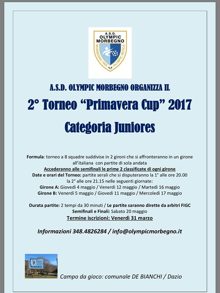 Prenderà il via questa sera la seconda edizione del torneo "Primavera Cup" riservato alla categoria Juniores. Alla rassegna organizzata dall'Olympic Morbegno prendono parte 8 formazioni che si sfideranno sul campo in erba artificiale di Dazio. Il compito di aprire le ostilità spetterà alle 20 a Chiavennese e Berbenno. Entrambe reduci dal campionato provinciale di categoria che ha visto la squadra del Mera chiudere a 57 punti e quella rivale a 32. I due scontri diretti stagionali hanno sempre premiato la Chiavennese. Alle 21,15 il secondo match, in campo Olympic Morbegno e Talamonese. I padroni di casa sono reduci da un brillante terzo posto con 56 punti nel girone B del campionato regionale B, per la squadra di Talamona invece 6° posto a livello provinciale con 39. Domani si disputeranno altre due partite sempre con i medesimi orari odierni. La prima tra quelle che sono le due squadre forse più attese della manifestazione, Sondrio e ColicoDerviese, la seconda tra Tiranese e PentaPiateda.