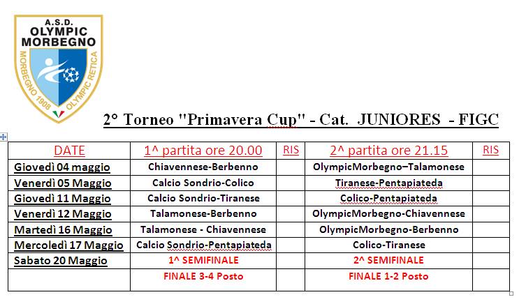 Dazio - La seconda serata ha visto esordire le altre 4 formazioni iscritte all'edizione 2017 della "Primavera Cup", manifestazione giovanile riservata alla categoria Juniores. Dopo il successo all'esordio del Berbenno sulla Chiavennese e il pareggio tra Olympic Morbegno e Talamonese, sul campo di Dazio le protagoniste sono state Sondrio e Tiranese grazie alle vittorie ottenute a spese di ColicoDerviese e Penta Piateda. Nel primo incontro la formazione del capoluogo ha superato 2-0 quella del lago grazie alle reti di Del Re e Piazzi. Senza storia la seconda sfida con il netto 4-0 inflitto dalla Tiranese alla Penta Piateda: Tognolini, Nhaiji, Bombardieri, Strafaci i marcatori. Il torneo riprenderà giovedì prossimo con  Sondrio-Tiranese (ore 20) e ColicoDerviese-Penta Piateda (21,15).