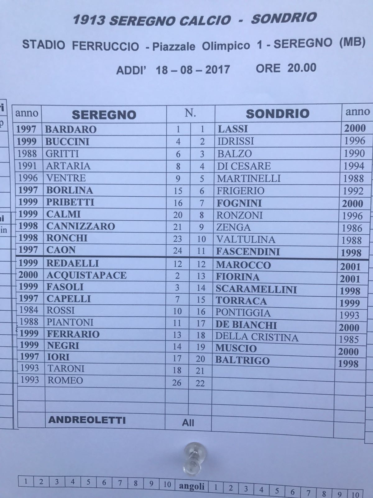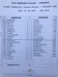 La terza amichevole stagionale si conclude con una sconfitta per i ragazzi di Luca Colombo. A Seregno, contro i padroni di casa prossimi protagonisti in serie D, il Sondrio perde 2-1. Primo tempo terminato sullo 0-0. La rete che sblocca il match è segnata da Grandi nella parte iniziale della ripresa. Il vantaggio dei locali dura poco, è Pontiggia a ripristinare la parità su rigore. Al 31' Seregno ancora avanti con Piantoni dagli undici metri.