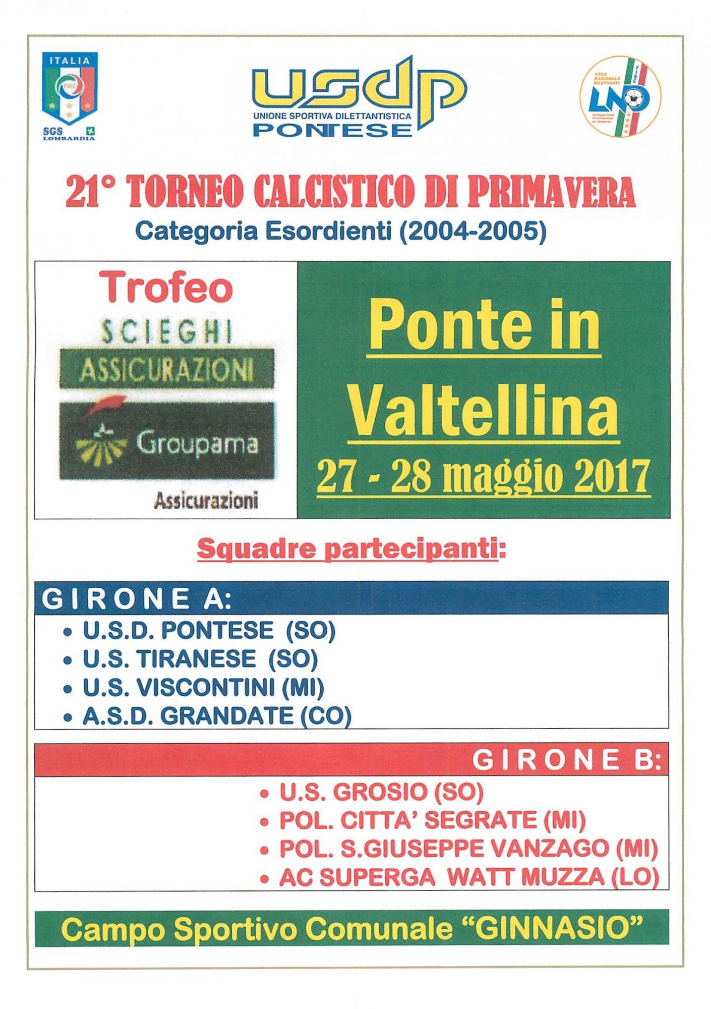 Appunamento classifico per il calcio giovanile da ormai 21 anni torna nel fine settimanta il "Torneo di Primavera", riservato alla categoria esordienti. Saranno due giorni intensi, ricchi di partite sul campo "Ginnasio" di Ponte in Valtellina con 8 squadre protagoniste suddivise in due gironi. Tre le valtellinesi, i padroni di casa della Pontese, Grosio e Tiranese, ben 5 quelle provenienti da fuori provincia: Viscontini (Milano), Città di Segrate (Milano), San Giuseppe Vanzago (Milano) Grandate (Como), Superga Watt Muzza (Lodi). L'inizio è previsto domani mattina alle 10, mentre domenica a partire dalle 14 si giocheranno le varie finali con la finalissima prevista attorno alle 16. Lo scorso anno ad imporsi fu il Menaggio.
