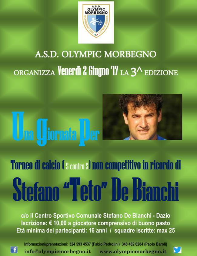 Saranno ben 30 le formazioni che daranno vita domani alla terza edizione del torneo di calcio a 5 "Una giornata per Teto". La manifestazione si svilupperà sin dal mattino a Dazio e vedrà scendere in campo almeno 245 giocatori, questo il numero finora degli iscritti. Un appuntamento sentito quello organizzato dall'Olympic Morbegno per ricordare Stefano De Bianchi che proprio ieri avrebbe compiuto gli anni. "Teto" ha lasciato un grande ricordo nel mondo del calcio locale per i suoi modi sempre garbati e gli amici amano ricordarlo onorandone la memoria con quella che era la sua grande passione, il calcio. Il torneo si aprirà alle 9 e da li in poi sarà un susseguirsi di sfide fino a trovare la formazione che tra le 30 avrà saputo sbaragliare la concorrenza.