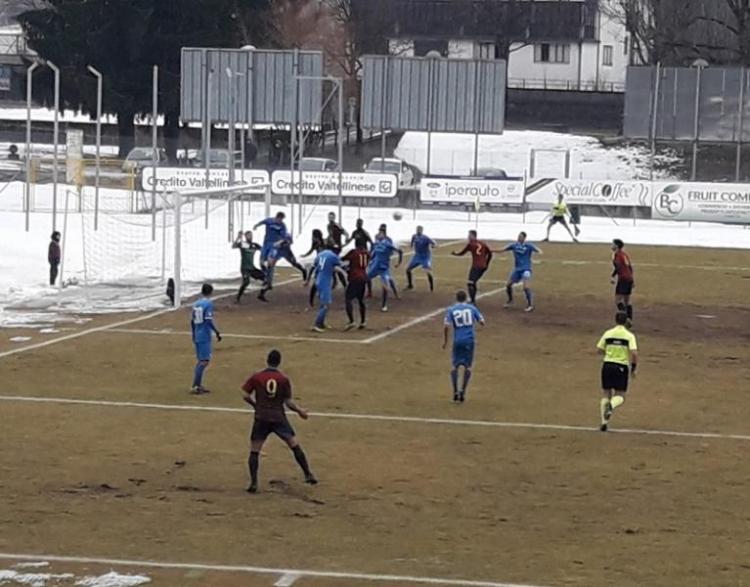Si chiude in parità la sfida salvezza tra Sondrio e Villafranca. Partita coretta per 88 minuti con gli animi che si sono accesi in campo e sugli spalti dopo il 2-2 ospite e l'esultanza provocatoria di Pellacani. Nel primo tempo per mole di gioco e per occasioni create si è fatta preferire la squadra ospite, mentre nella ripresa il Sondrio ha preso campo e creato i presupposti per arrivare ai tre punti sfumati solo nel finale. Al 4° minuto punizione per il Villafranca battuta da Pellacani con pallone fuori di poco alla destra di Guerci. Al 16° Beltrame dal limite, destro a mezz'altezza deviato in tuffo da Rossi. Al 19° punizione di Beltrame, testa di Mara e palla in rete, ma la bandierina alzata del guardalinee vanifica la giocata. Uscita imperfetta di Guerci, palla a Pape Faye che in rovesciata dal dischetto del rigore manda alto. Al 27° ci prova ancora il numero 11 ospite con una conclusione sporca dal limite che non impensierisce Guerci. Pochi secondi dopo la miglior occasione della partita, corner di Elefante e colpo di testa di Avanzi sul primo palo, palla sull'esterno della rete con Guerci fermo. Al 36° il vantaggio dei veronesi, punizione di Elefante, un difensore allontana di testa sui piedi di Pellacani che di prima intenzione calcia e batte Guerci. L'inizio della ripresa con un Sondrio più convinto e al quarto d'ora arriva il premio, grande azione sulla sinistra di Beltrame e cross pennellato sul secondo palo dove in tuffo De Respinis di testa non sbaglia e firma il pari. Ancora Beltrame protagonista al 23° con un tiro da 30 metri a cercare di sorprendere il portiere fuori dai pali, la mira però non premia il numero 20. Alla mezz'ora raddopio dei padroni di casa, punizione dal lato corto dell'area di rigore battuta da Beltrame, palla verso il portiere con D'Amuri che anticipa e tocca quel tanto che basta per mettere fuori tempo Rossi. Al 37° percussione di Beltrame, questa volta sulla destra del fronte d'attacco, e palla al centro dove D'Amuri impegna Rossi. Al 42° inaspetttato il pareggio ospite, punizione dal limite battuta forte da Pellacani, respinta di un difensore ma ancora Pellacani di testa batte Guerci che smanaccia senza però riuscire ad impedire il gol.