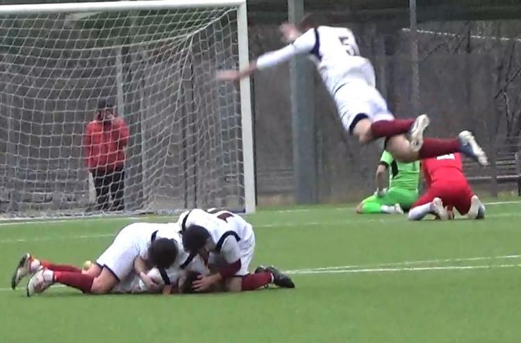 Il tuffo di Davide Rinaldi per festeggiare il 2-1 di Valli in Grosio-Ardenno Buglio