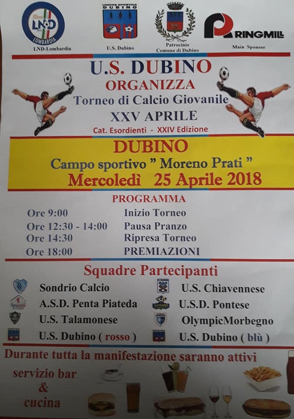Giornata riservata ai ragazzi della categoria Esordienti al "Moreno Prati" di Dubino dove per l'intera giornata andrà in scena il torneo giovanile del "XXV Aprile". Giunta alla 24^ edizione la kermesse organizzata dalla società di casa vedrà protagoniste 8 formazioni della nostra provincia. Il programma prevede l'inizio del torneo alle 9, la pausa per il pranzo dalle 12,30 alle 14,30 poi di nuovo in campo e alle 18 le premiazioni. A contedersi la vittoria saranno Sondrio, Penta Piateda, Talamonese, Dubino Rosso, Chiavennese, Pontese, Olympic Morbegno, Dubino Blu. Lo scorso anno in condizioni climatiche ben diverse da quelle odierne, pioggia battente per tutto il pomeriggio, ad imporsi fu la Chiavennese battendo il finale il Cosio.