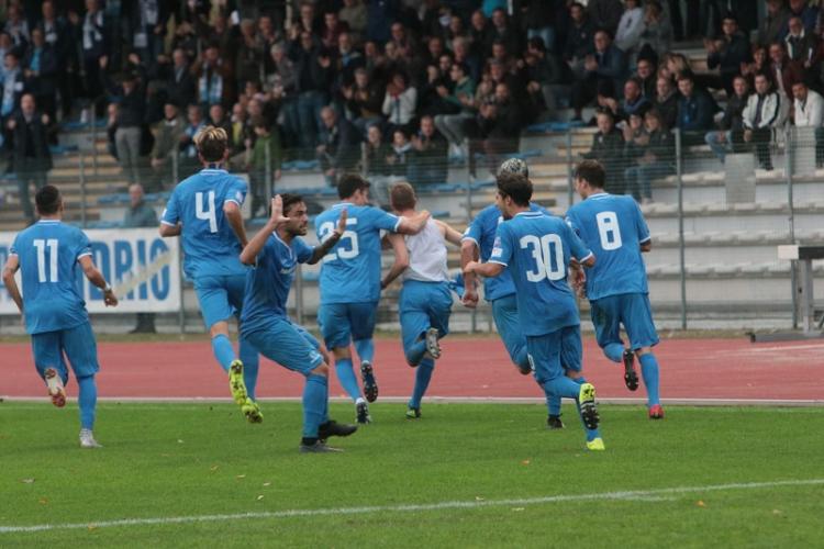L'esultanza dopo il gol di Beltrame contro la Caronnese