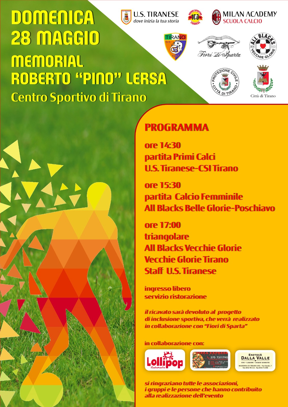 È in programma questo pomeriggio al campo sportivo di Tirano il Memorial Roberto "Pino" Lersa, figura di spicco del calcio tiranese. Un pomeriggio di partite aperto alle 14,30 dalla sfida tra US Tiranese e CSI Tirano che vedrà protagonista la categoria Primi Calci. Alle 15,30 sarà la volta delle donne con il match tra All Blacks Belle Glorie e Poschiavo. Alle 17 il clou con il triangolare tra All Blacks Vecchie Glorie, Staff US Tiranese e Vecchie Glorie Tirano. L'ingresso è libero e per tutta la durata dell'evento sarà attivo un servizio di ristorazione: tutto il ricavato sarà devoluto al progetto di inclusione sportiva che verrà realizzato in collaborazione con "Fiori di Sparta". "Fiori di Sparta" è un'organizzazione di volontariato che nasce nella primavera del 1999 per favorire l'aggregazione di famiglie con persone disabili e garantire di questi ultimi la tutela dei diritti e la partecipazione alla vita sociale.