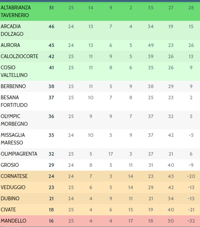 Agenda serale piuttosto ricca con ben 5 recuperi in programma e tre valtellinesi protagoniste. Partiamo dalla Prima categoria con la disputa dei match validi per l'ottava giornata di ritorno. Serata che si preannuncia molto difficile per Dubino e Olympic Morbegno, attese dalle sfide con le prime due della classifica. Alle 20,45 al Moreno Prati scenderà in campo l'Alta Brianza Tavernerio, formazione reduce da due passi falsi, ma che sembra avviata verso la promozione. I padroni di casa devono cercare di fare punti in ogni modo per rilanciare una classifica resa più preoccupante dalla sconfitta nello scontro diretto con il Civate. All'Amanzio Toccalli si giocherà alle 20,30 il match tra Olympic Morbegno e Arcadia Dolzago. Per i morbegnesi serve una vittoria per provare a rimanere agganciati al treno playoff, i lecchesi hanno la necessità dei tre punti per cercare di tenere viva la lotta per il primo posto. Alle 20,30 si giocano anche due partite che avranno risvolti pesanti nella lotta salvezza e alle quali guarda ovviamente con interesse il Dubino: Mandello-Veduggio e Olimpiagrenta-Civate. Un recupero è in programma anche per il campiomato di Seconda categoria e si tratta di Victoria-Talamonese. La partita, valida per l'ottava di ritorno, si giocherà alle 21 a Calolziocorte. Per i lecchesi è forse l'ultima opportunità per ritornare in gioco in ottica playoff, mentre Ronconi e compagni hanno la possibità di blindare il terzo posto.