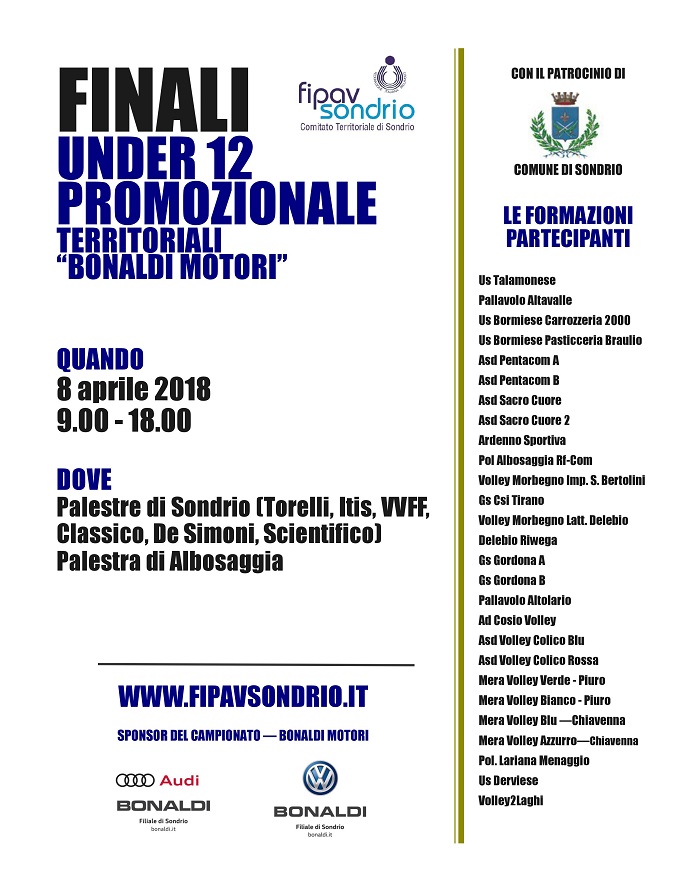 Si assegna domenica il titolo territoriale della categoria under 12 misto "Bonaldi Motori" e sarà una giornata intensa, ricca di partite con protagoniste ben 27 squadre e circa 300 giovani atleti. Le finali dell'under 12 misto si trasformano sempre in un evento con la città di Sondrio che ospiterà nelle varie palestre gran parte delle gare. Al centro di tutto la palestra dell'Itis, all'interno del campus scolastico, dove a partire dalle 10 si disputeranno le semifinali e nel primo pomeriggio, dalle 14,30 in poi, le finali per il primo e terzo posto e le premiazioni di tutte le squadre che hanno preso al campionato. A contendersi il titolo saranno Gs Gordona, Cosio, Pallavolo Altolario e Riwega. Sul parquet della Torelli si disputeranno a partire dalle 10 le finali dal 4° all'8° posto con protagoniste Bormiese, Talamonese, Pentacom A, Pallavolo Altavalle. Alla palestra dell'Istituto De Simoni sono in programma gli incontri che assegneranno le posizioni dalla 9^ alla 12^ con in campo Volley Bianco Piuro, Volley Colico Blu, Volley Verde Piuro, Polisportiva Menaggio. Anche Albosaggia sarà protagonista di questo tour de force con le partite per il 13°/16 posto che vedranno affrontarsi oltre alla squadra di casa anche Ardenno Sportiva, Volley Morbegno, Asd Sacro Cuore 2. Si torna nel capoluogo per le finali dal 17° al 20° posto in programma presso la palestra del Liceo Classico che vedranno scendere in campo Pentacom B, Volley Blu Chiavenna, Gordona B, Bormiese Gelateria Braulio. I match validi dalla 21^ alla 24^ posizione si giocheranno presso la palestra dei Vigili Del Fuoco e avranno come protagoniste Derviese, Morbegno Latteria Delebio, Csi Tirano, Volley Azzurro Chiavenna. Infine, al Liceo Scientifico, le sfide dal 25° al 27° posto tra Asd Sacro Cuore 1, Volley Colico, Volley2Laghi.