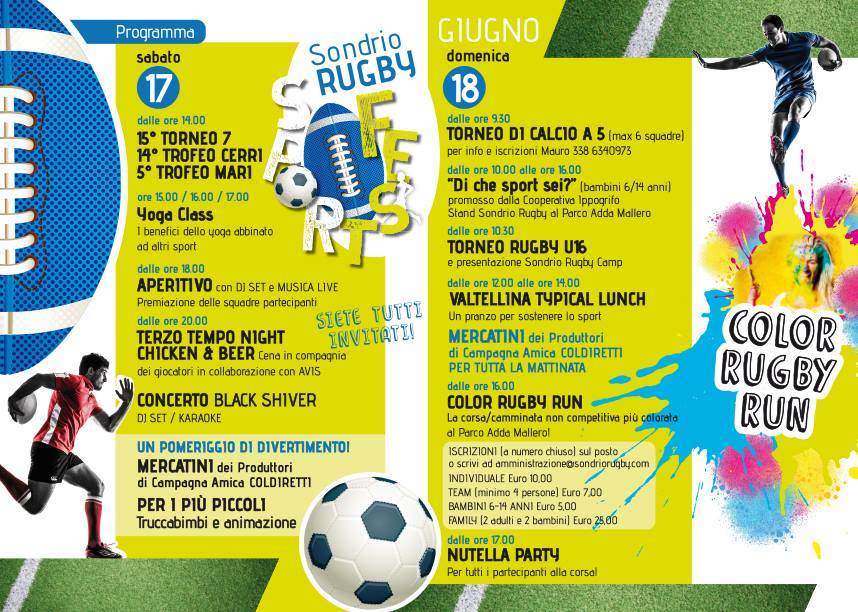 Il Sondrio Rugby ha fatto le cose in grande per la festa di fine stagione. Tra oggi e domani saranno un susseguirsi di appuntamenti di vario genere che movimenteranno il capoluogo e permetteranno al sodalizio di raccogliere fondi per completare la nuova sede che verrà inaugurata ufficialmente a settembre. Al Torneo Seven, un classico di fine stagione valido anche come Memorial Cerri e Mari, si aggiungono eventi per tutti i gusti. Dai momenti culinari a quelli musicali con dj set e concerto dei Black Shiver, dal già citato torneo di rugby a 7 giocatori a quello di calcio a 5, e ancora mercatini, truccabimbi, animazione e tanto altro compresa, per gli amanti della corsa, la Color Run al Parco Bartesaghi.