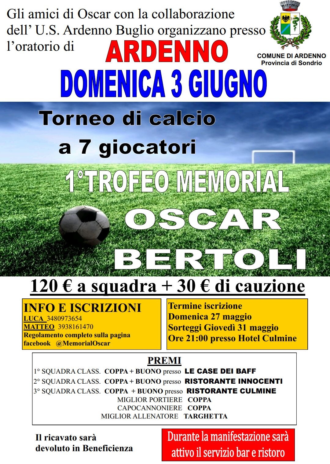 Il Bar Igloo è la prima squadra a scrivere il proprio nome nell'albo d'oro del Memorial Oscar Bertoli, torneo di calcio a 7 organizzato dagli Amici di Oscar con la collaborazione dell'Ardenno Buglio. Sono state 12 le protagoniste della prima edizione e tra queste la migliore si è rivelata il Bar Igloo, capace di battere in finale 6-0 la formazione del Csi Gialli con una tripletta di Nana e reti di Zuccalli, Invernizzi e Lombella. Più sofferta la vittoria in semifinale a spese del GF Arredamenti, 2-1 firmato da Zuccalli, Invernizzi e per i rivali da Speziale. Il Csi Gialli ha raggiunto la finalissima dopo aver piegato 3-1 gli Amici di Oscar con gol di Bana, Mauri, Pedretta e De Giovanni. La finale per il terzo posto tra GF Arredamenti e Amici di Oscar è terminata 2-1 con doppietta di Bianchini e rete di Marco Perilli. Il premio per il miglior portiere è stato assegnato a Mattia Romeri (Amici Di Oscar), mentre Daniele Bianchini (GF Arredamenti) si è aggiudicato con 6 reti il titolo di capocannoniere. È stato premiato anche Mattia Bianco (Csi Gialli) come miglior allenatore.